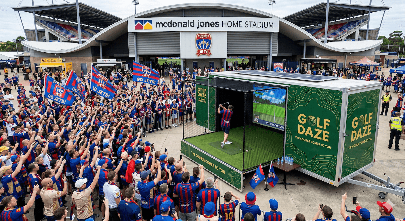 Golf Daze is Australia's first fully mobile golf simulator experience. Our purpose-built caravan rolls to your venue, the side opens down to create a professional stage hitting area, and your guests play 1,000+ world-class courses in stunning 4K β no course required.