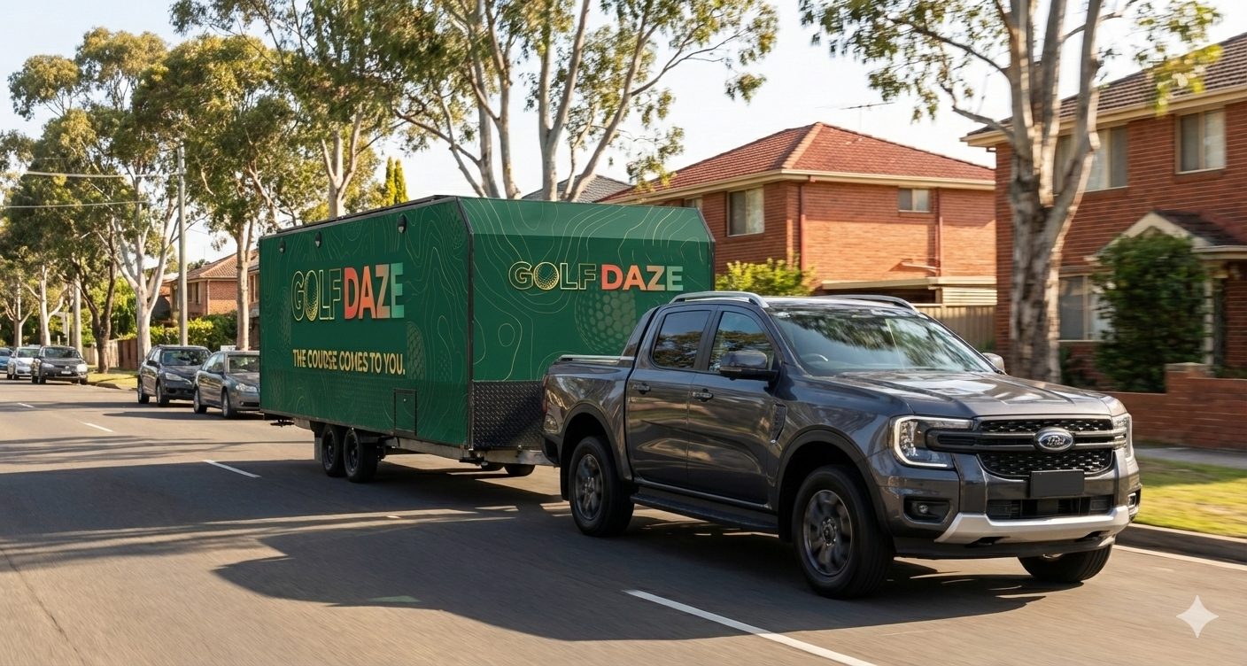 Golf Daze is Australia's first fully mobile golf simulator experience. Our purpose-built caravan rolls to your venue, the side opens down to create a professional stage hitting area, and your guests play 1,000+ world-class courses in stunning 4K β no course required.
